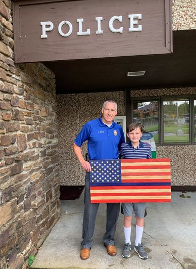 At the same time, Jeremiah and I gave a duplicate flag to Chief Hahn for their Police Station. Both flags had Kevin’s badge perfectly carved into the Union and an attached plaque. We believe in giving back.