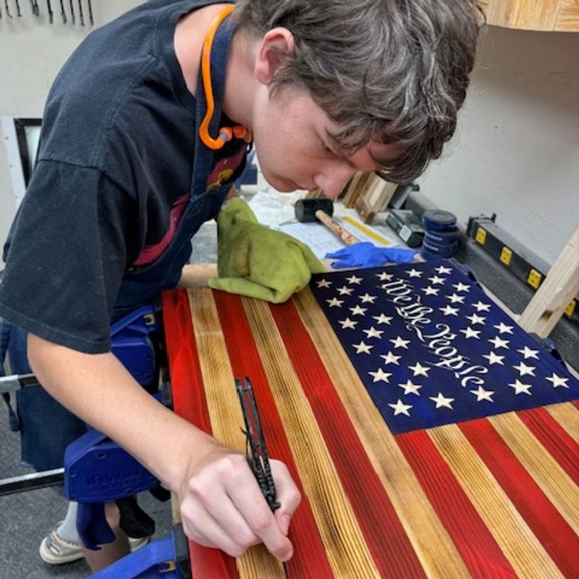 He does a great job burning stripes and building our beautiful wooden flags. He loves working with his hands and learning new skills. How lucky can a grandfather get?